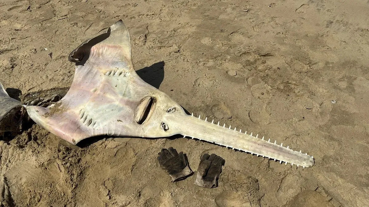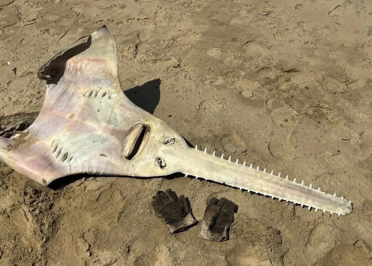 An extraordinary marine creature thought to be long lost along the eastern coasts has reappeared and washed ashore again. The large sawfish, with a body resembling a guitar and a long structure extending from its snout, was recorded as a rare sighting in the region’s memories. This event reminded us of the existence of a species associated with an unknown time period.